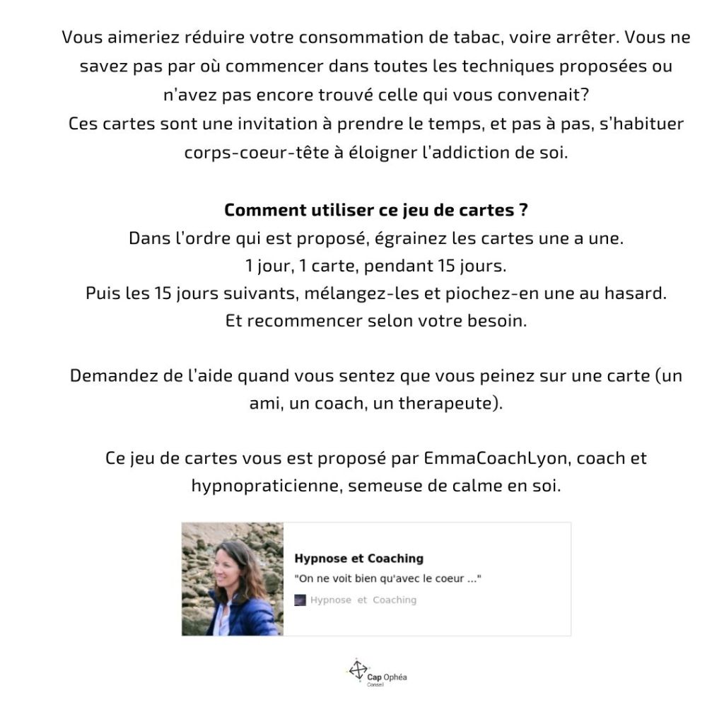 Ce jeu de cartes vous est proposé par EmmaCoachLyon, coach et hypnopraticienne, semeuse de calme en soi.